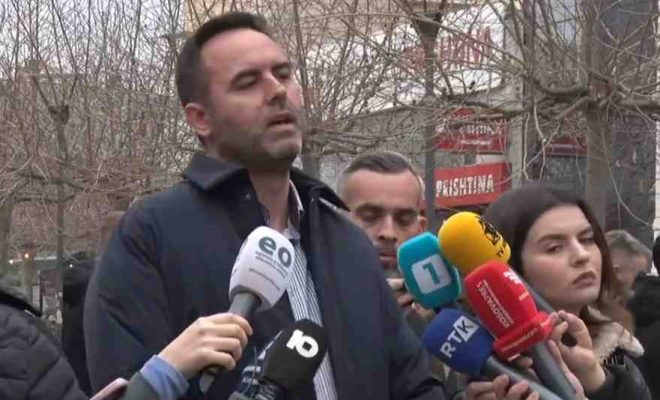 Deputeti Glauk Konjufca ka folur para gazetarëve në oborrin e Kuvendit të Kosovës derisa është larguar pas urdhrit të policisë.