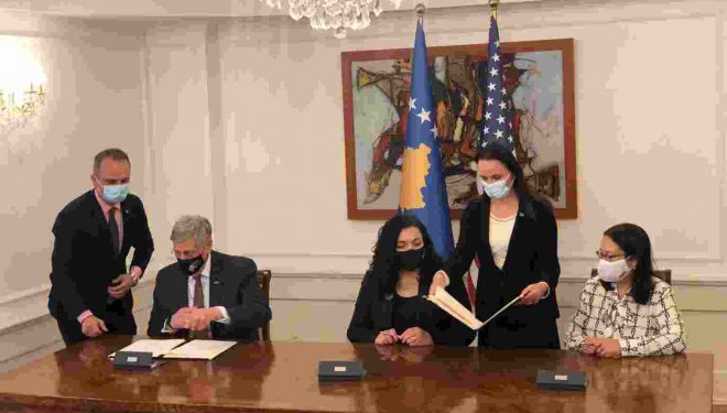 Presidentja Vjosa Osmani së bashku me drejtoreshën e USAID-it për Kosovë, Lisa Magno dhe ambasadorin e Shteteve të Bashkuara të Amerikës në Kosovës, Philip S. Kosnett kanë nënshkruar amandamentimin e Marrëveshjes së Grantit me USAID, raporton Ekonomia Online.