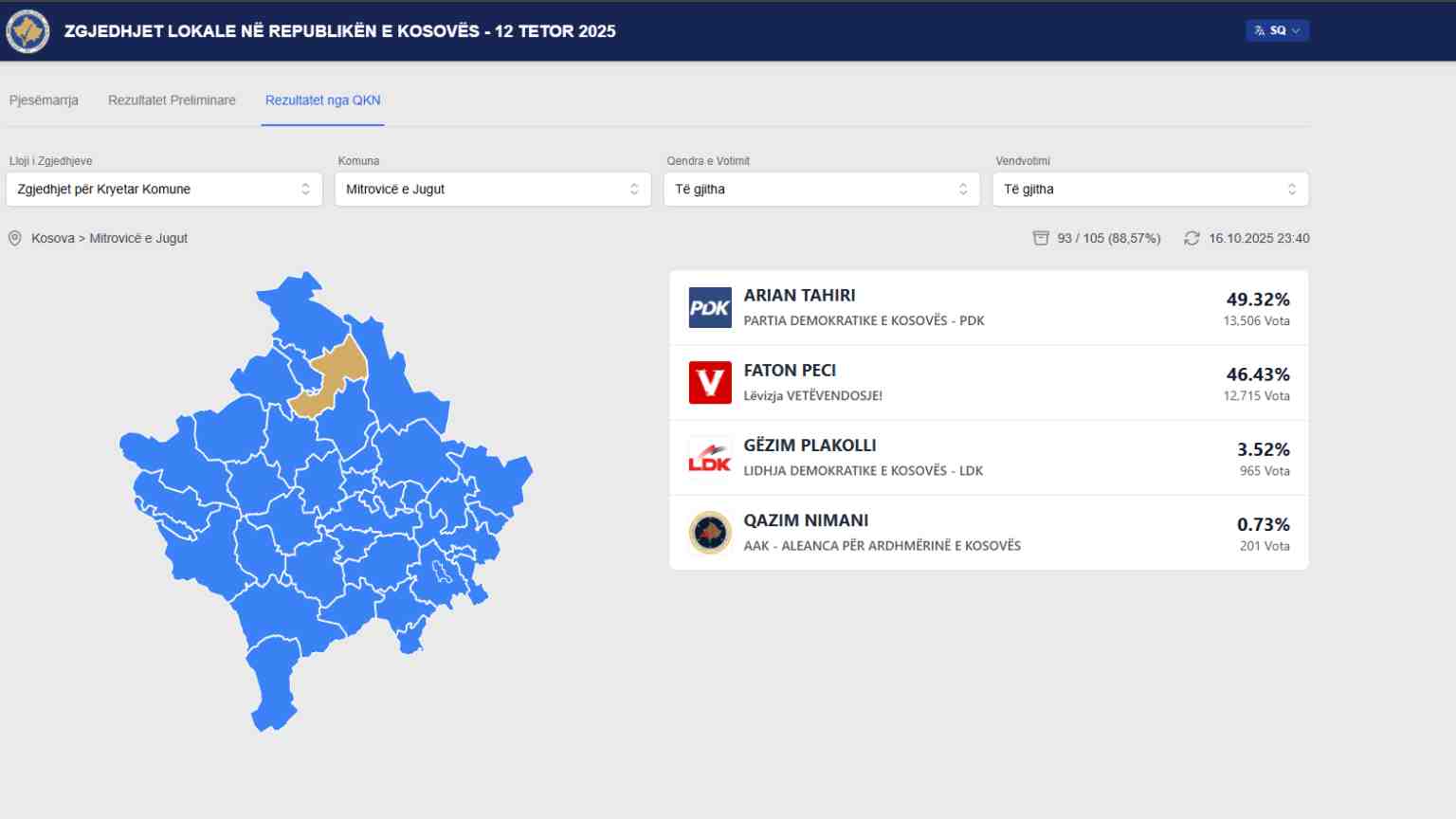 Atje, KQZ njofton se kandidati i Partisë Demokratike të Kosovës, Arian Tahiri, ka 48.04%, ose 14,905 Vota.