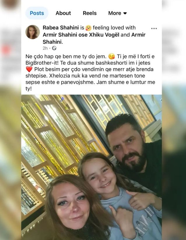 “Në çdo hap që bën me ty do jem. Ti je më i forti i Big Brother-it! Të dua shumë bashkëshorti im i jetës. Plot besim për çdo vendim që merr atje brenda shtëpisë. Xhelozia nuk ka vend në martesën tonë sepse është e panevojshme. Jam shumë e lumtur me ty”, shkruan Rabea në postimin e saj.