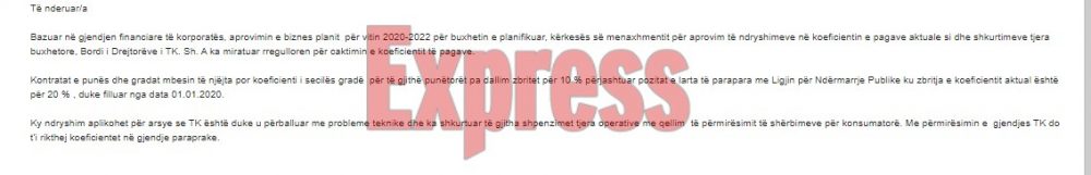 Aty shkruhet se bazuar në gjendjen financiare të koorporatës, janë detyryar që të bëjnë shkurtime buxhetore, ku edhe kanë miratuar rregulloren për caktimin e koeficientit të pagave. Kontratat e punës, tutje shkruhet se mbesin të njejta.