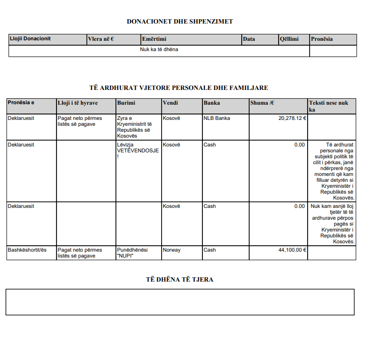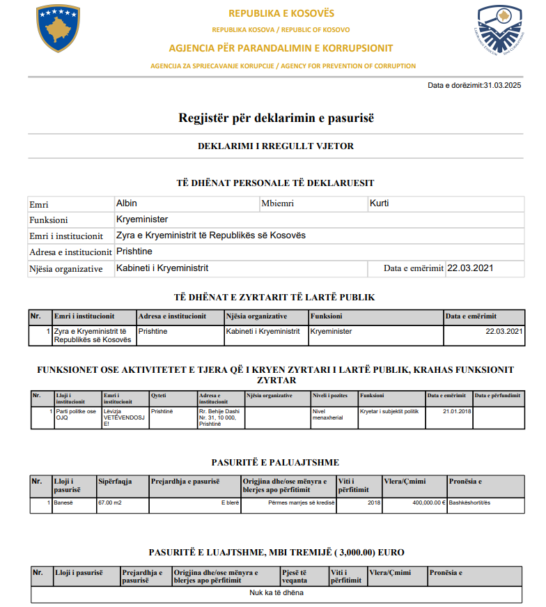 Kryeministri në dorëheqje, Albin Kurti, ka bërë deklarimin vjetor të pasurisë pranë Agjencisë për Parandalimin e Korrupsionit. Nga deklarimi i dorëzuar në mars, del se bashkëshortja e tij ka dyfish më shumë të hyra vjetore sesa ai, shkruan Reporteri.net.