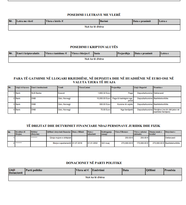 Aty përmendet edhe kredia në vlerë 170 mijë euro që ka bashkëshortja e tij për blerjen e apartamentit. Kjo është shuma e mbetur nga vlera totale e kredisë 270 mijë euro.