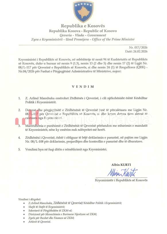 “Kryeministri i Republikës së Kosovës, në mbështetje të nenit 94 të Kushtetutës së Republikës së Kosovës, duke u bazuar në nenin 9 (1.3), nenin 13 (2 dhe 5) dhe nenin 17 (2) të Ligjit Nr. 08/L-117 për Qeverinë e Republikës së Kosovës, si dhe nenin 24 (1) të Rregullores (QRK) Nr.04/2026 për Fushat e Përgjegjësisë Administrative të Ministrive, nxjerr: Z. Arlind Manxhuka emërohet Zëdhënës i Qeverisë, i cili njëkohësisht është Këshilltar Politik i Kryeministrit”, thuhet në vendimin e qeverisë.