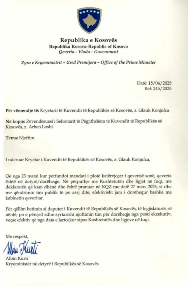 “Që nga 23 marsi kur përfundoi mandati i plotw katërvjeçar i qeverisë sonë, qeveria është në detyrë/dorëheqje. Në përputhje me Kushtetutën dhe ligjet në fuqi, me deklaratën që kam dhënë dhe është pranuar në KQZ me datë 27 mars 2025, si dhe me qëndrimin tim publik të po asaj dite, efektivisht jam i dorëhequr bashkë me kabinetin qeveritar. Për qëllim betimin si deputet i Kuvendit të Republikës së Kosovës, të legjislaturës së nëntë, po e përcjell edhe zyrtarisht njoftimin tim për dorëheqje nga posti ekzekutiv, veçse efektiv që nga data e lartcekur sipas Kushtetutës dhe ligjeve në fuqi”, thuhet në letrën e dorëheqjes së Kurtit.