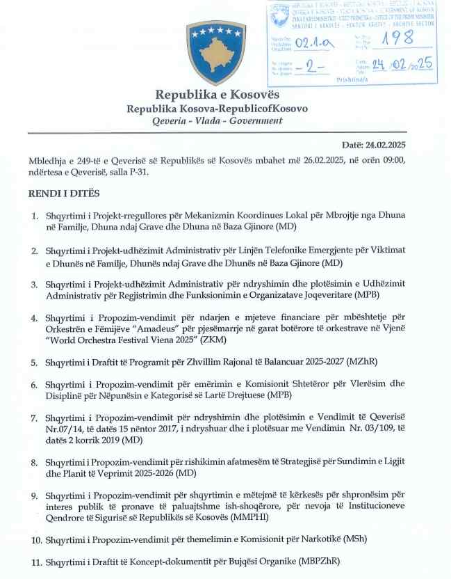 Në rend dite janë 14 pika, ku shumica janë propozime të Ministrisë së Drejtësisë.