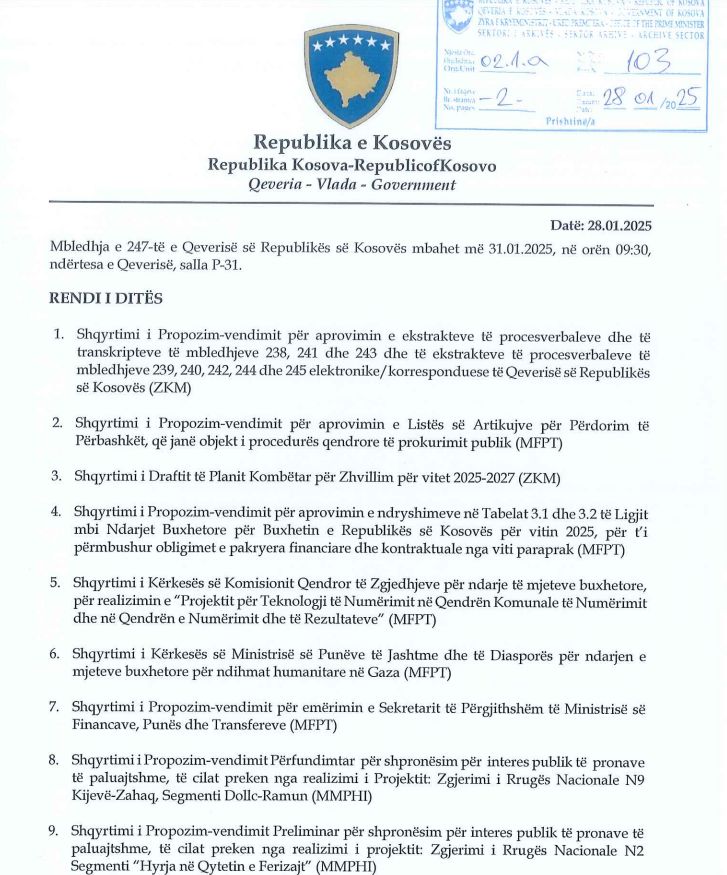Në këtë mbledhje do të shqyrtohet edhe propozimi për dhënien në shfrytëzim të pronave të Agjencisë së Pyjeve të Kosovës, për nevoja të Ministrisë së Mbrojtjes dhe Forcës së Sigurisë së Kosovës dhe propozimi për themelimin e Këshillit Organizativ për shënim të 17 shkurtit- Ditës së Pavarësisë.