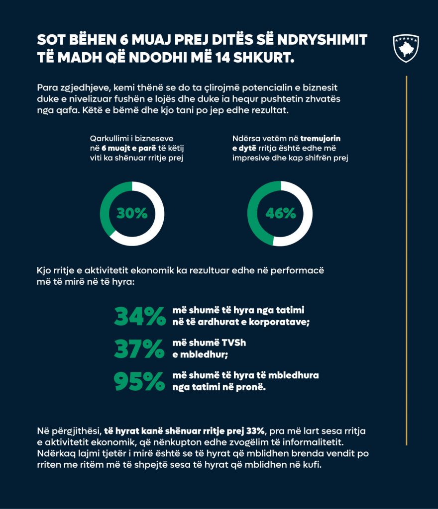 “Qarkullimi i bizneseve në 6 muajt e parë të këtij viti ka shënuar rritje prej 30 për qind, ndërsa vetëm në tremujorin e dytë rritja është edhe më impresive dhe kap shifrën prej 46 për qind. Kjo rritje e aktivitetit ekonomik ka rezultuar edhe në performancë më të mirë në të hyra, ku 34 për qind ka më shumë të hyra nga tatimi në të ardhura të korporatave, 37 për qind më shumë TVSH e mbledhur dhe 95 për qind më shumë të hyra të mbledhura nga tatimi në pronë.