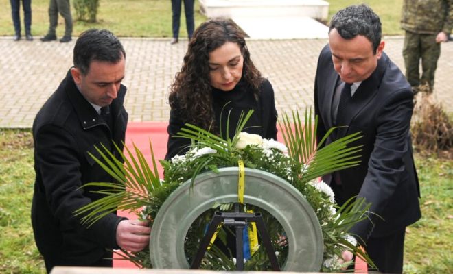“Pranë pllakës që shënon sinagogën e fundit në Kosovë, e cila ishte pjesë e çarshisë së vjetër të Prishtinës, në Ditën Ndërkombëtare Përkujtimore të Holokaustit, bashkë me Presidenten e Republikës, Vjosa Osmani dhe Kryetarin e Kuvendit, Dimal Basha vumë kurorë me lule në përkujtim të të gjitha viktimave që u vranë me plumba dhe gaz, që u dogjën në krematoriume, apo vdiqën nga kushtet e tmerrshme nëpër kampet e përqendrimit dhe nga aksionet e nazistëve gjatë viteve të Luftës së Dytë Botërore”, ka shkruar Kurti.