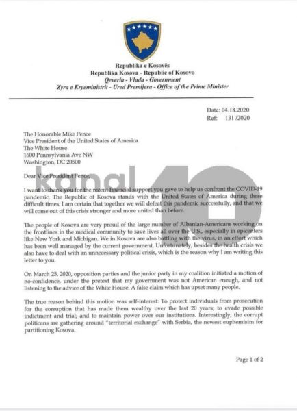 “Më 25 mars të 2020’ës, partitë opozitare dhe partia në koalicionin tim ka iniciuar mocionin e mosbesimit, nën pretekstin se qeveria ime nuk ishte mjaftueshëm pro-amerikane, e as nuk i dëgjoi këshillat e Shtëpisë së Bardhë. Një pohim i rremë që ka nervozuar shumë njerëz”, ka shkruar Kurti në letër.