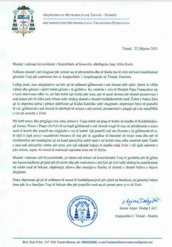 “Është e bukur fjala që ju shprehni për sa i përket shërbimit që Kisha Katolike ndër shqiptarë, nëpërmjet bijve të popullit të vet, gjithmonë e më shumë të shërbejë me rritjen e atij uniteti, prosperiteti e paqeje, që e ka zanafillën e vet në zemrën e Zotit”, shkruan Dodaj në letrën e tij për kryeministrin Kurti.