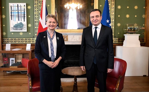 Pak para fillimit të punimeve të Samitit të Procesit të Berlinit, i cili po mbahet në Londër, Kryeministri në detyrë i Republikës së Kosovës, Albin Kurti, u mirëprit në takim nga Sekretarja e Shtetit për Punë të Jashtme të Mbretërisë së Bashkuar, Yvette Cooper.