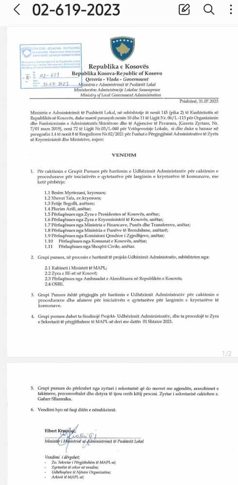 Në vendimin që është publikuar nga MAPL, është caktuar grupi punues për hartimin e Udhëzimit Administrativ për caktimin e procedurave për iniciativën e qytetarëve për largimin e kryetarëve të komunave.