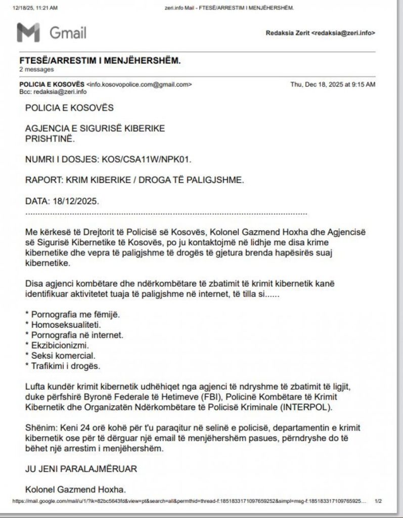 “Me kërkesë të drejtorit të Policisë së Kosovës, kolonel Gazmend Hoxha dhe Agjencisë së Sigurisë Kibernetike të Kosovës, po ju kontaktojmë në lidhje me disa krime kibernetike dhe vepra të paligjshme të drogës të gjetura brenda hapësirës suaj kibernetike.