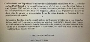 Në letrën e Prokurorisë së përgjithshme thuhet se: “Në përputhje me Konventën Evropiane të ekstradimit nga 1957, z. Ramush Haradinaj iu paraqit Prokurorit të Përgjithshëm të Apelit në Colmar me 5 janar, që ia tregoi atij kërkesën për mbajtje të përkohshme dhe ia tregoi masat e kryegjyqtarit të Apelit që të merren masat në mënyrë që të garantohet përfaqësimi i tij para Drejtësisë franceze me rastin e procedurës se ekstradimit”.
