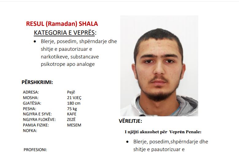 Policia e Pejës është duke e kërkuar Resul Shalën, i cili dyshohet për “Blerje, posedim, shpërndarje dhe shitje e paautorizuar e narkotikeve, substancave psikotrope apo analoge”