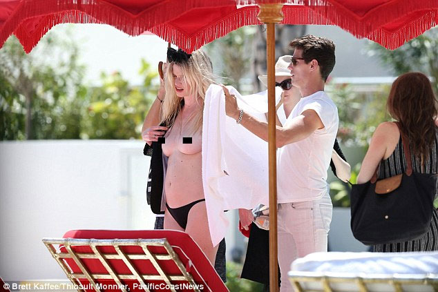 Ajo është fotografuar nga paparacët topless teksa bëhej gati për setin e fotove me bikini apo trupore. Ajo kishte veshur vetëm një xhaketë të zezë, dhe një palë mbathje të zeza, duke shfaqur të gjitha asetet e saj.