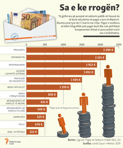Numri i punonjësve që marrin paga nga buxheti i Kosovës është rreth 82 mijë veta. Paga mesatare në sektorin publik, sipas të dhënave të fundit të Agjencisë së Statistikave të Kosovës, në vitin 2018 ishte 573 euro.