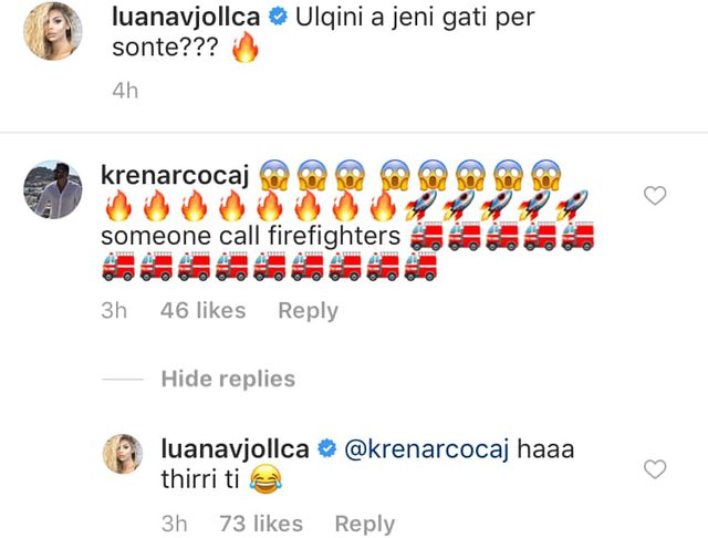 Look-u i saj pas make up-it dje, bëri që një lumë komentesh të vërshonin në videon e postuar, por ndër të tjerë dalloi ai i Krenarit, i cili i shkroi: “Dikush të thërrasë zjarrfikësen”. Përgjigja e Luanës?! “Thirri ti”, ndërsa e shoqëroi edhe me disa buzëqeshje.