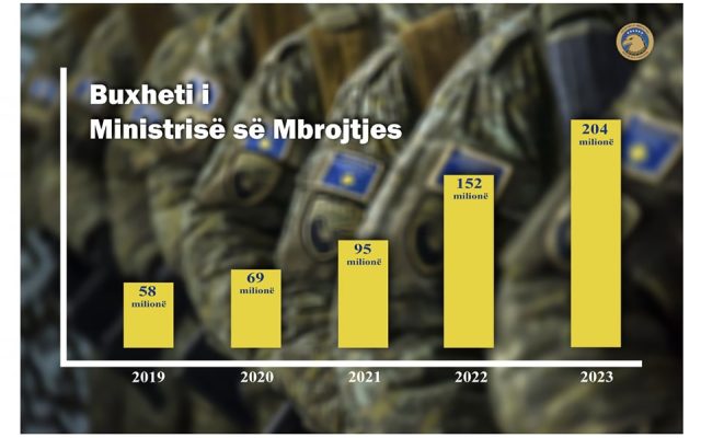 Ministri i Mbrojtjes, Ejup Maqedonci duke përmendur buxhetin e ndarë ndër vite nga Qeveria e Kosovës, ka thënë se 204 milionë ishte buxheti i ndarë për ushtrinë gjatë vitit 2023.