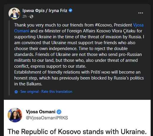 “Faleminderit shumë ndaj miqëve nga Kosova, presidentja Vjosa Osmani, ish-ministrja e Integrimeve Evropiane, Vlora Çitaku për përkrahjen ndaj Ukrainës në kohën e kërcënimit të invazionit nga Rusia. Jam e bindur që Ukraina duhet të mbështes miqt e vërtetë që kanë zgjedhur pavarësinë e tyre. Koha që të refuzohen standardet e dyfishta. Miqt e Ukrainës nuk janë ata që dërgojnë militantë pro-rusë në vendin tonë, por ata që edhe përkundër kërcënimit me konflikt shprehin mbështetje për shtetin tonë. Vendosja e marrëdhënieve miqsore me Prishtinën do të bëhet një hap i sinqertë, që në të kaluarën është bllokuar nga politikat e Rusisë në Ballkan”, ka shkraur ajo.