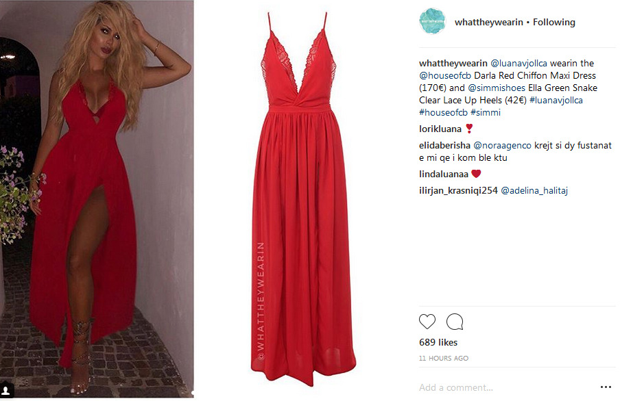 Mesa duket fustani i kuq ka kushtuar 170 euro, ndërsa takat ose sandalet e Luanës kanë kushtuar 42 euro. /Gazeta Express/