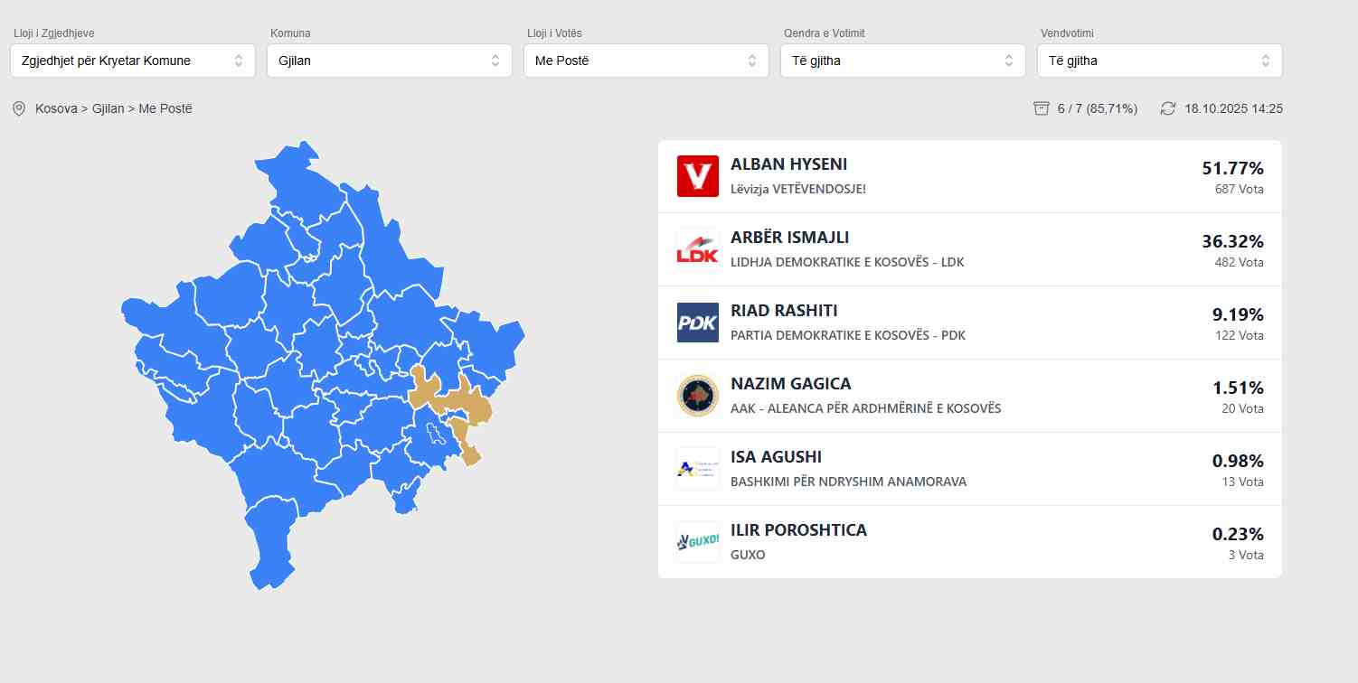 Sipas rezultateve preliminare, Hyseni në total, bashkë me votat e diasporës, ka 22.140 vota apo 49.84%, ndërsa Ismajli i LDK-së ka 15.245 vota apo 34.29%.