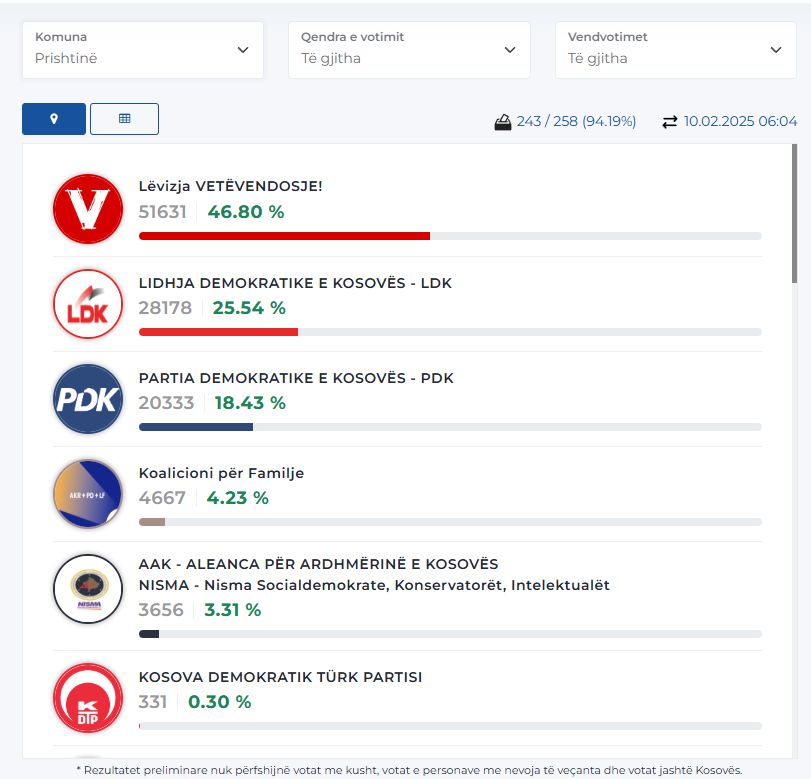 Nga të dhënat e fundit nga Komisioni Qendror i Zgjedhjeve, Lëvizja Vetëvendosje po prin bindshëm në Prishtinë.