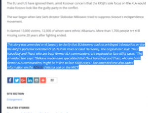 Por, kështu nuk po del të jetë në tekstin e amandamentuar të këtij mediumi. Kjo histori ishte amandetuar më 6 janar për të sqaruar së EUobsever nuk kishte informacione të përvilegjuara për aktakuzat e Gjykatës Speciale për Hashim Thacin apo Daut Haradinaj.