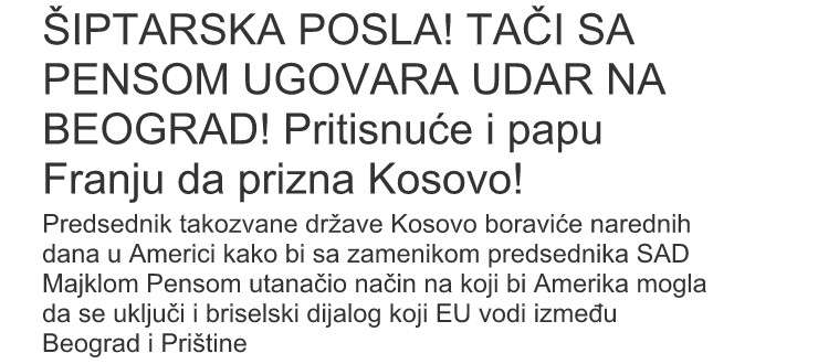 “Punë shiptare (šiptarska)! Thaçi me Pence-in planifikon sulm ndaj Beogradit! Do të bëj trysni ndaj Papës për ta njohë Kosovën!”, mban titullin kjo gazetë.
