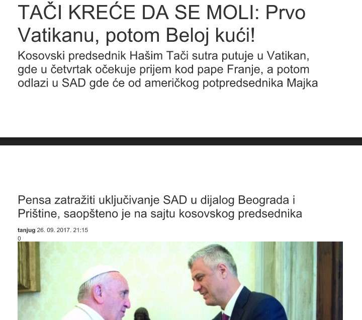 “Thaçi në vizitë private te Papa foli për dialogun mes Prishtinës dhe Beogradit”, është titulli i agjencisë serbe të lajmeve, “Tanjug”.
