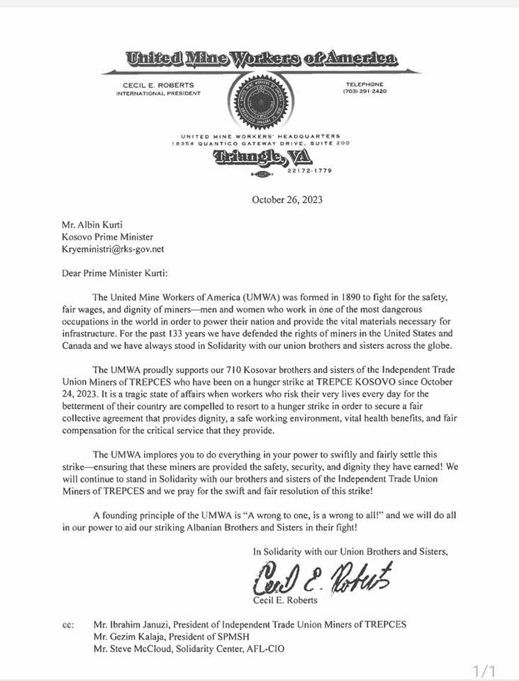 “UMWA me krenari përkrah 710 vëllezërit dhe motrat tona kosovare të Minatorëve të Sindikatës së Pavarur të TREPÇES-it të cilët janë në grevë urie në TREPÇE KOSOVË që nga 24 tetori 2023”, thuhet në letër./Telegrafi