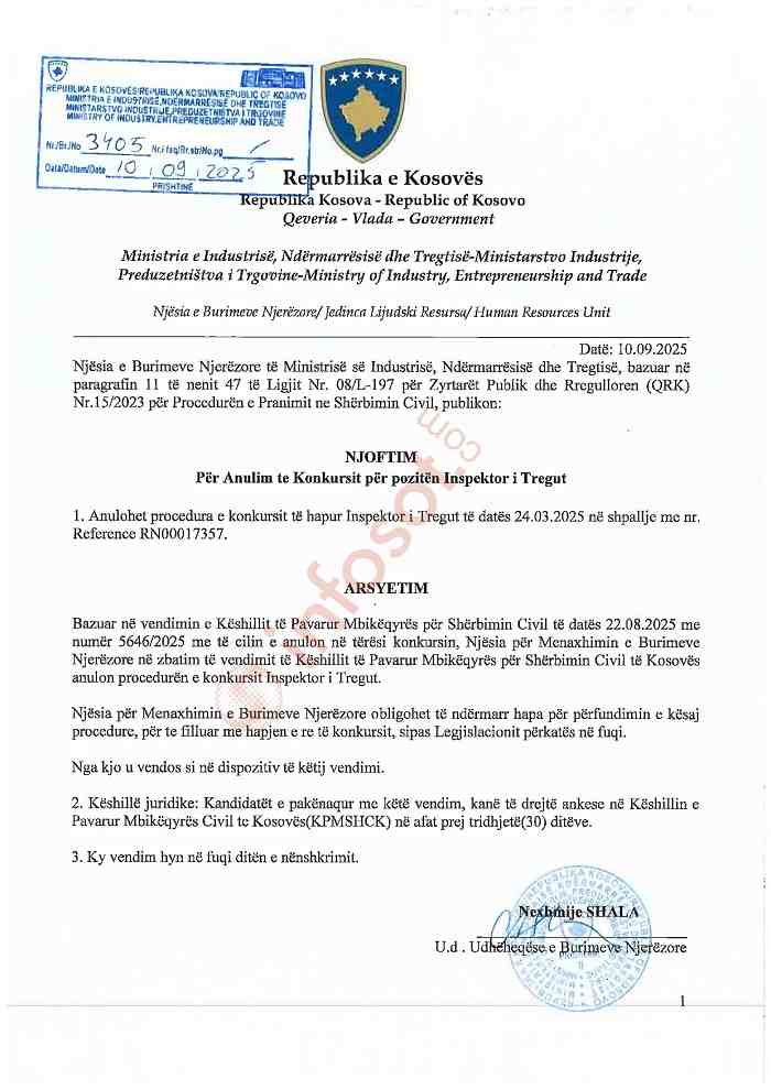 Ministria e Industrisë, Ndërmarrësisë dhe Tregtisë (MINT) ka njoftuar anulimin e tërësishëm të konkursit për rekrutimin e 16 inspektorëve të tregut, pas vendimit të Këshillit të Pavarur Mbikëqyrës për Shërbimin Civil (KPMSHC).