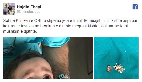 Në një postim në Facebook, Thaçi ka treguar se është kryer një operacion i suksesshëm ndaj një fëmije 16 muajsh të cilit i është nxjerrë një kokërr fasuleje nga bronku i djathtë.