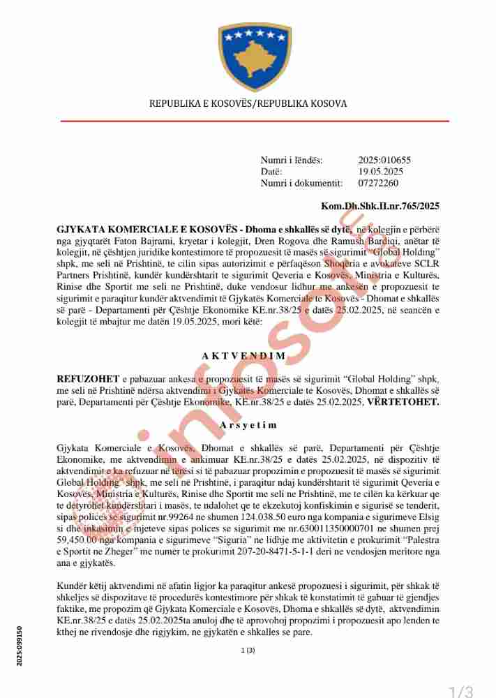 Gjykata Komerciale e Kosovës, Dhoma e Shkallës së Dytë ka hedhur poshtë ankesën e kompanisë “Global Holding” Sh.p.k ndaj vendimit të Shkallës së Parë që kishte refuzuar kërkesën për vendosjen e masës së sigurimit ndaj Ministrisë së Kulturës, Rinisë dhe Sportit (MKRS), lidhur me tenderin për ndërtimin e palestrës së sportit në fshatin Zhegër të komunës së Gjilanit, raporton Infosot.