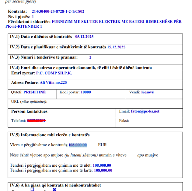 Kontrata e nënshkruar ka një kohëzgjatje prej 36 muajsh, ndërsa tenderi i është besuar operatorit ekonomik “P.C Comp” Sh.P.K. Vlera e përgjithshme e kontratës është 108,000 euro, duke shënuar një rregullim të fundit nga vlera fillestare prej 120,000 euro, që ishte parashikuar fillimisht.