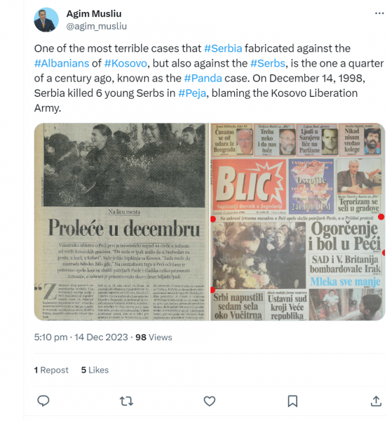 “Një nga rastet më të tmerrshme që #Serbia sajoi kundër #shqiptarëve të #Kosovës, por edhe ndaj #Serbëve, është ai i një çerek shekulli më parë, i njohur si rasti #Panda. Më 14 dhjetor 1998, Serbia vrau 6 të rinj serbë në Pejë, duke fajësuar Ushtrinë Çlirimtare të Kosovës” shkruan Musliu./Express/
