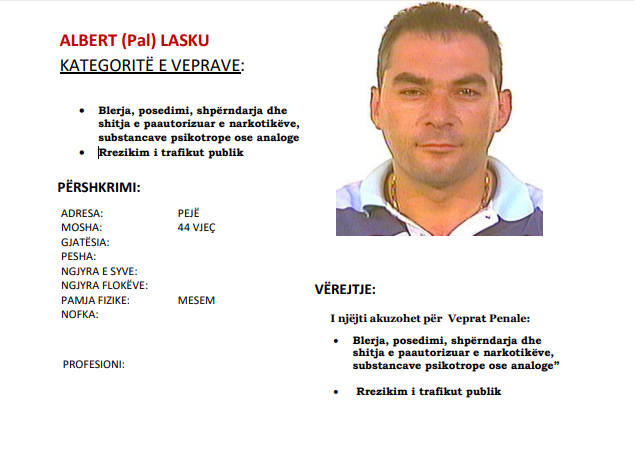 “Policia e Kosovës – Drejtoria Rajonale e Policisë në Pejë, bazuar në ligj për publikimin e fotos me shënime tjera të personit të kërkuar më Urdhëresë të Gjykatës Themelore Ferizaj dhe Gjakovё, me qëllim lokalizimin dhe rrjedhimisht arrestimin e tij, lëshon: Kërkesë për bashkëpunim me qytetarët. Personi i kërkuar është: ALBERT (Pal) LASKU i lindur me 21.04.1976 nё PEJË”, thuhet në njoftim.