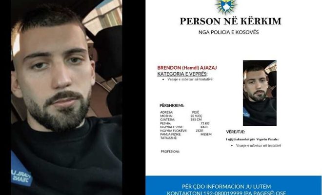 “Personi i kërkuar është: BRENDON (Hamdi) AJAZAJ i lindur me 19.10.2005 nё shtetin e Gjermanisё. I pandehuri është i kërkuar për veprën penale: Vrasje e mbetur në tentativë. Policia e Kosovës kërkon nga qytetarët e Republikës së Kosovës që kushdo që ka informacion për vendndodhjen e personit të dyshuar në foton e bashkangjitur, të lajmërojë Policinë e Kosovës apo të lajmërohet në stacionin më të afërt policor”, thuhet në njoftim.
