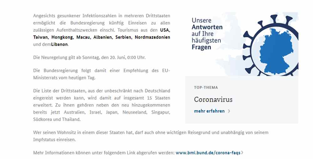 Lista e vendeve të treta nga të cilat dikush mund të udhëtojë në Gjermani pa kufizime është zgjeruar në një total prej 15 vendeve. Përveç atyre të reja, ato tashmë përfshijnë Australinë, Izraelin, Japoninë, Zelandën e Re, Singaporin, Korenë e Jugut dhe Tajlandën.