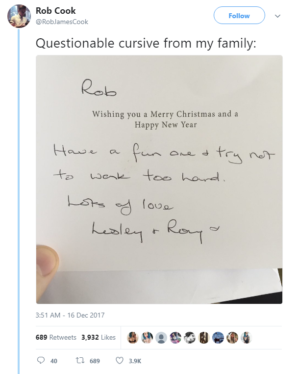 Dhe nëse do të lexohej ashtu, i bie që ata ti kenë shkruar: ‘Rob. Të urojmë një Krishtlindje të Gëzuar dhe një Vit të Ri të Gëzuar. Argëtohu dhe përpiqu të mos masturbosh. Shumë dashuri Lesley dhe Roy’. /Telegrafi/