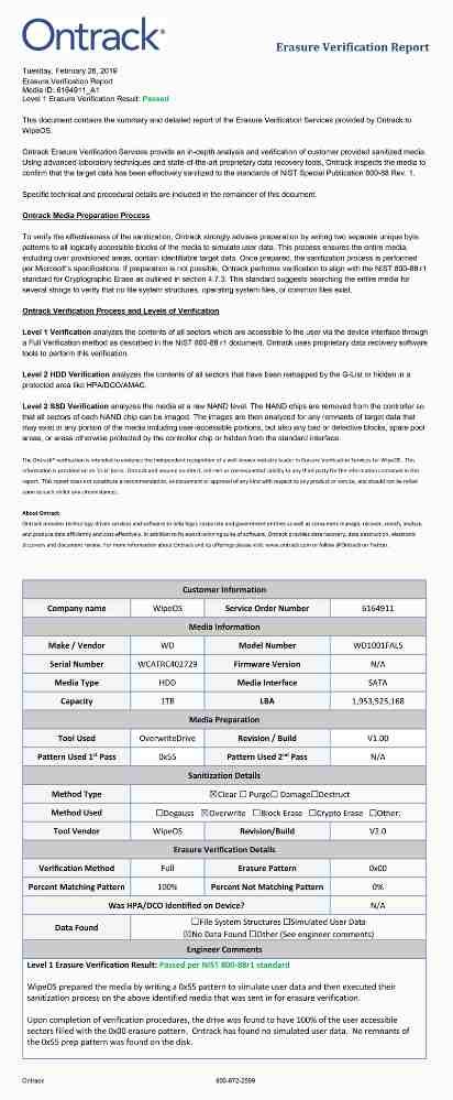 Në raportin e saj kompania për kthyerjen (recovery) e të dhënave Ontrack ka lëshuar certifikatën për WipeOS ku konfirmon këtë inovacion.