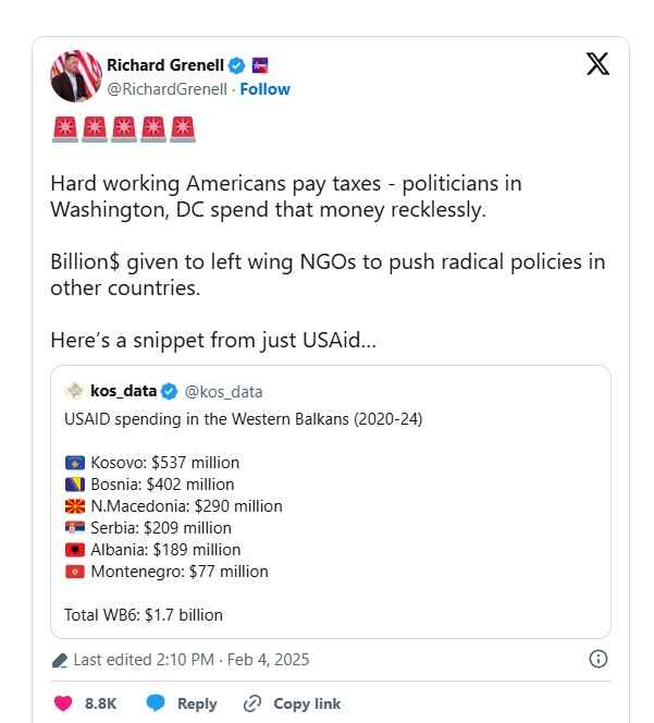I dërguari i SHBA-së për Misione të Posaçme, Richard Grenell ka njoftuar për vlerën e fondeve të USAID që kanë përfituar shtetet e Ballkanit.