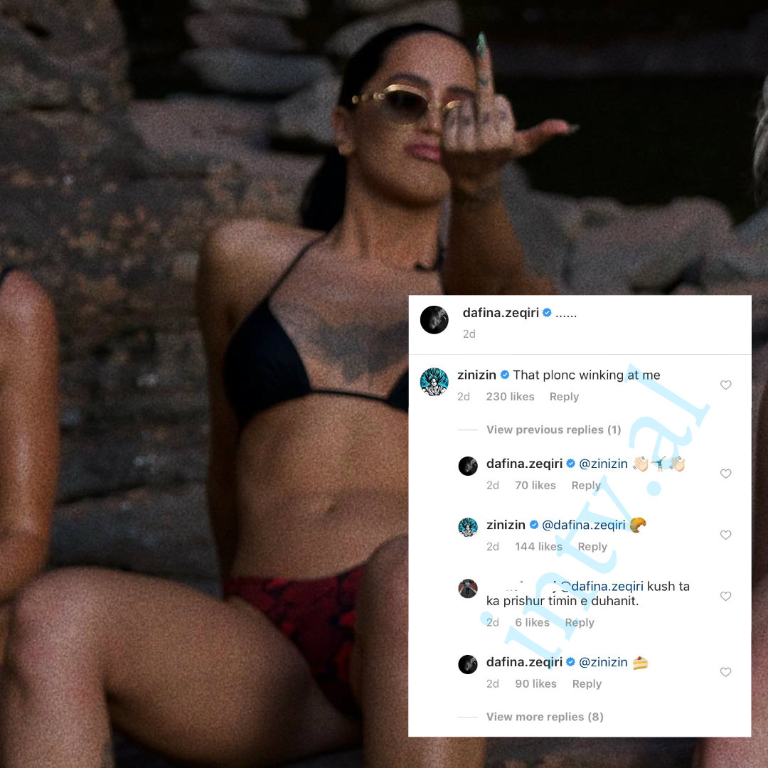 Kjo foto ka marrë shumë reagime, por më të bukur e ka bërë Noizy. Duke marrë shkas nga barku i Dafinës, Noizy i ka thënë që “plonci” (e ka fjalën për barkun), po ia bën me sy.