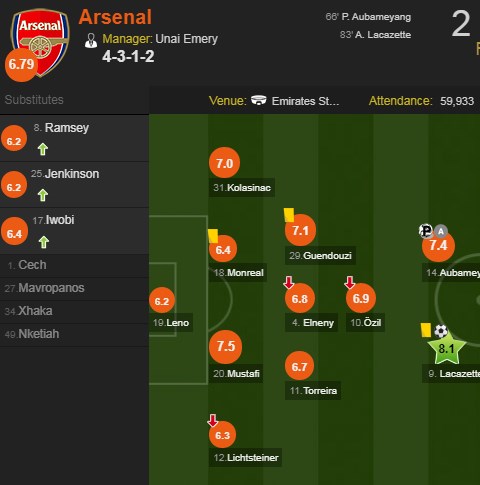 Dyshja janë lojtarët më të notuar të kësaj ndeshje, pasi francezi është notuar me 8.1, ndërsa Auba me 7.4.