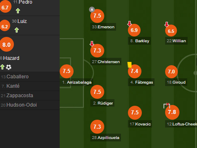 Golashënuesi i vetëm, Eden Hazard, është lojtari me notën më të lartë (8.0) te ekipi vendas, edhe pse u inkuadrua nga banka rezervë. Pas tij renditet Ruben Loftus-Cheek (7.8).