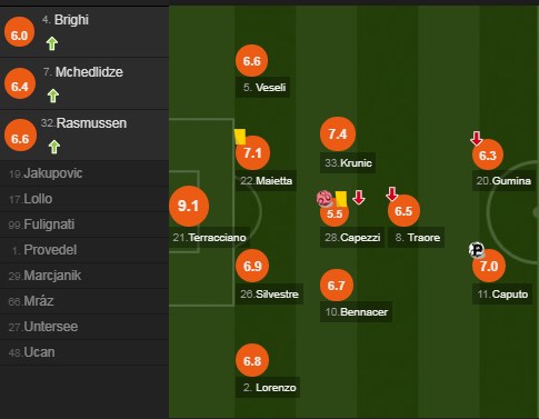 Donnarumma është notuar me 6.1, ndërsa Capezzeli që shënoi autogol ka marr notën 5.5, duke qenë lojtari më i dobët në ndeshje.