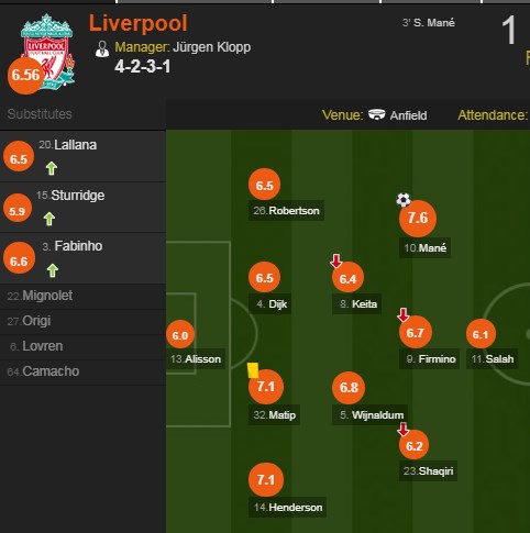 Vetëm Matip dhe Henderson kishin notat mbi 7.00, ndërsa Shaqiri ishte ndër më të dobëtit me 6.2.