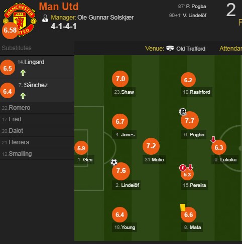 Fytyra tragjike e United ishte De Gea që pësoi dy gola, duke u notuar me notën 5.9. Por më dobët se ai ishte Pereira me 5.3.