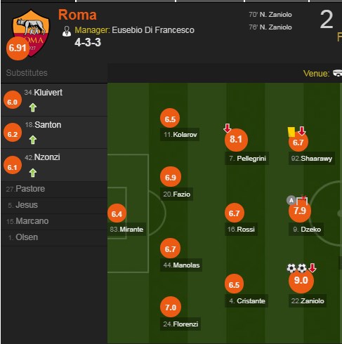 I riu Zaniolo ishte yll i mbrëmjes duke arritur të shënojë dy herë dhe duke u notuar me 9.0.